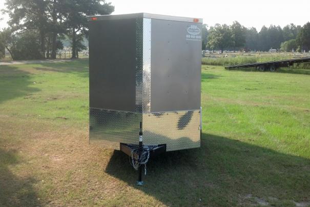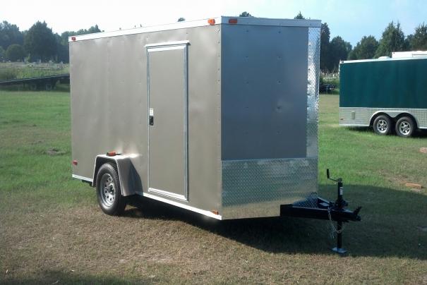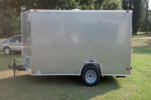 7 Wide Trailer with 12 foot box plus additional V-Nose. Side entry door with flush mount RV style loch with piano hinges (No Cheap Strap Hinges). 3/4 plywood Floors and 3/8 Plywood walls, 12 interior dome light, roof vent, double spring assist rear ramp door with extension flap, Double rear tail lights. 2 5/16 hitch with 7 way plug. Electric brakes on single 3500# axle.