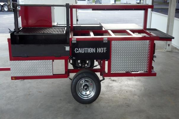 36" 60,000 btu Flat Griddle, 60" of poly resign cutting boards 5 12" X 20" steam slots, a 36" steam manifold, A tailgate that doubles as a rear tray, under neath storage as well as front storage compartments. It come with a 8' x 12" sneeze guard 12" high speed tires mounted on rally wheels, Roll up jack stand and extra top shelves comes on our standard unit. Built with 2" square tubing and powder coated to look great years.