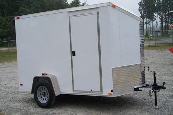 6x12 Enclosed Trailer-w/ Slant V Nose. Includes ¾ Plywood Floors, 3/8 Plywood Walls, Side Entry Door, Roof Vent, 12 V Interior Dome Light, Rear Ramp Door, ATP Stone Guard, 2” Coupler.