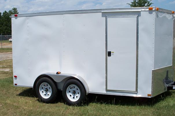 7x16 Enclosed Trailer-w/ V Nose Tandem 3500lb Axles. Includes ¾ Plywood Floors, 3/8 Plywood Walls, Side Entry Door, Roof Vent, 12 V Interior Dome Light, Rear Ramp Door, ATP Stone Guard, 2 5/16” Coupler, Electric Brakes &Breakaway on both axles, w/ LED Taillights. |