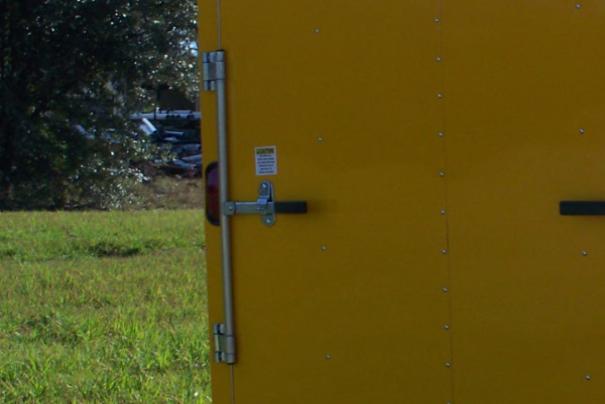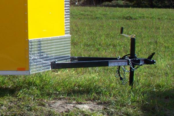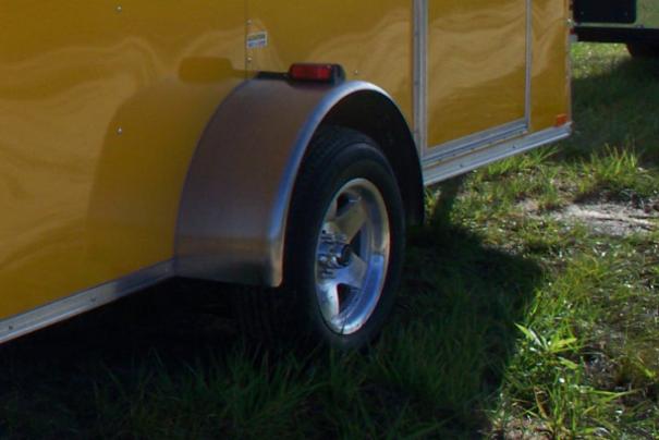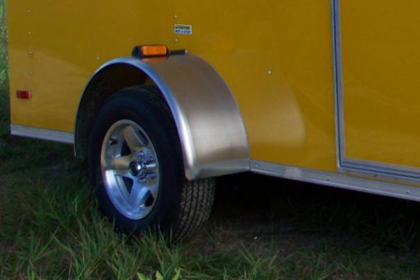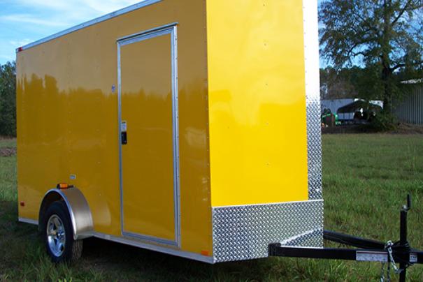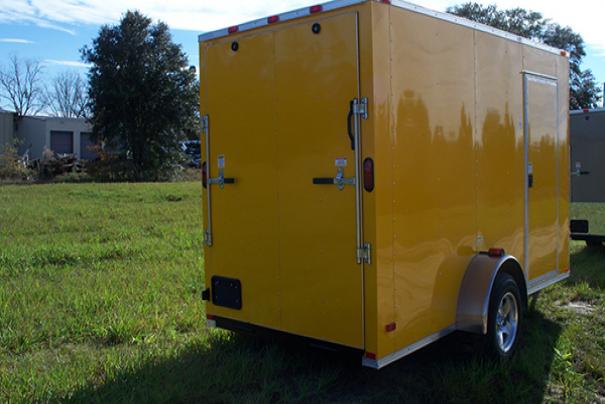 6x12 Enclosed Cargo Trailer – w/V-nose,Single 3500# Axle. . Includes ¾ Plywood Floors, 3/8 Plywood Walls, Side Entry Door, Roof Vent, 12 V Interior Dome Light, Rear Ramp Door, ATP Stone Guard, .030 Yellow Exterior,Alloy wheels w/radial tires, Round Fenders, 16” On Center, 6’6” Interior height, and extended Tongue .. |