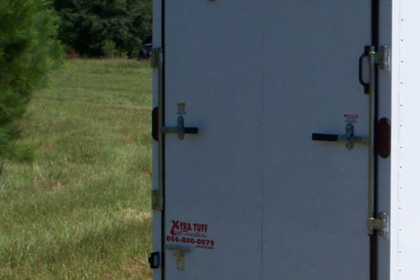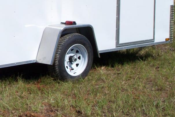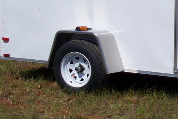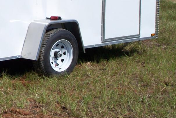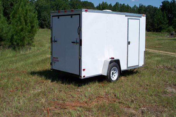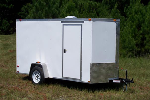 6x14 Enclosed Cargo Trailer – w/V-nose,Single 3500# Axle. . Includes ¾ Plywood Floors, 3/8 Plywood Walls, Side Entry Door, Roof Vent, 12 V Interior Dome Light, Rear Ramp Door, ATP Stone Guard.