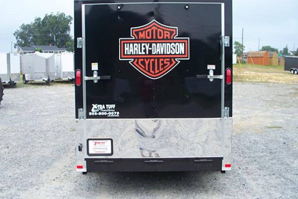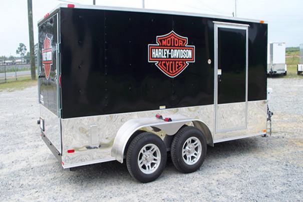 7x16 Enclosed Trailer-w/ V Nose Tandem 3500lb Axles. Includes ¾ Plywood Floors, 3/8 Plywood Walls, Side Entry Door, Roof Vent, 12 V Interior Dome Light, Rear Ramp Door, ATP Stone Guard, 2 5/16” Coupler, Electric Brakes &Breakaway on both axles, Includes Motorcycle Package: 24” Anodized Surround, Stabilized Jacks, 6 recessed d-ring tie downs, flow through vents, Alloy wheels with radial tires. Also includes Harley Decals and Electric tongue Jack. |