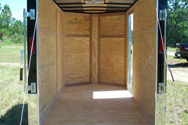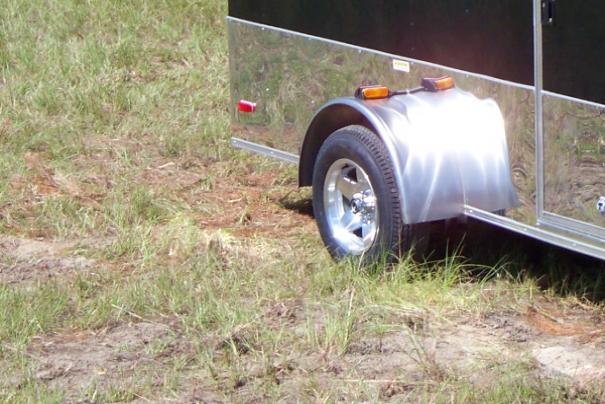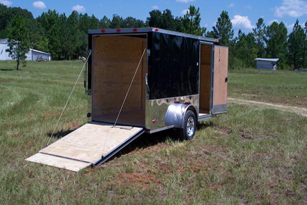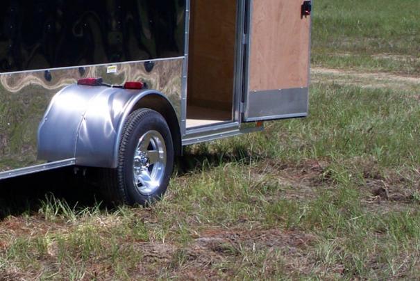 6x12 Enclosed Trailer-w/ V Nose. Includes ¾ Plywood Floors, 3/8 Plywood Walls, Side Entry Door, Roof Vent, 12 V Interior Dome Light, Rear Ramp Door, ATP Stone Guard, 2” Coupler. Includes: Black color,Anodized 24” Surround, Round Fenders and Alloy Wheels w/ radial tires. |