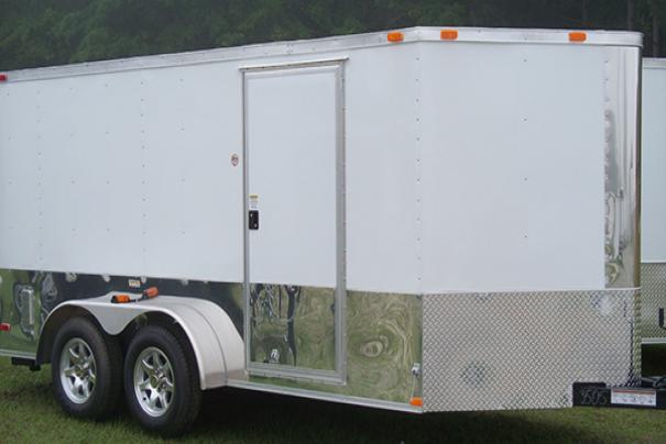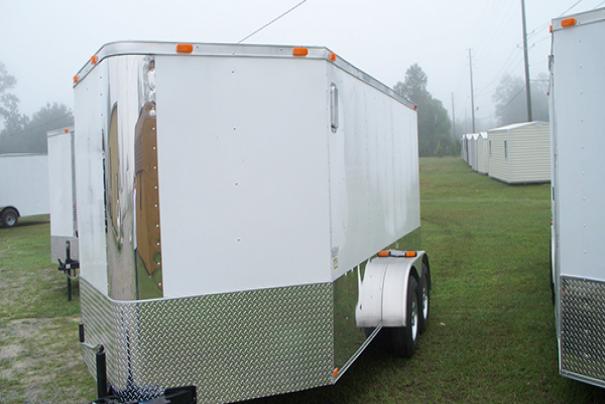 7x14 Rounded V-nose Enclosed Motorcycle Trailer. Tandem 3500lb Axles. Includes ¾ Plywood Floors, 3/8 Plywood Walls, Side Entry Door, Roof Vent, 12 V Interior Dome Light, Rear Ramp Door, ATP Stone Guard, 2 5/16” Coupler, Electric Brakes &Breakaway on both axles, Includes Motorcycle Package: 24” Anodized Surround, Stabilized Jacks, 6 recessed d-ring tie downs, flow through vents, Alloy wheels with radial tires. |