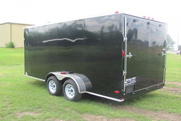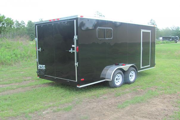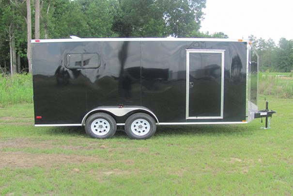 7x18 Slant V-Nose Enclosed Trailer with Side entry door, Rear Ramp door with double spring assist,and Tandem 3500# axles with electric brakes and brake aways on both axles.Trailer Inclused all of our standard features as well as .030 Black Screwless Metal, Polished Front Corners, 30x15 Curbside Window and 6 foot 6 inch interior height. |